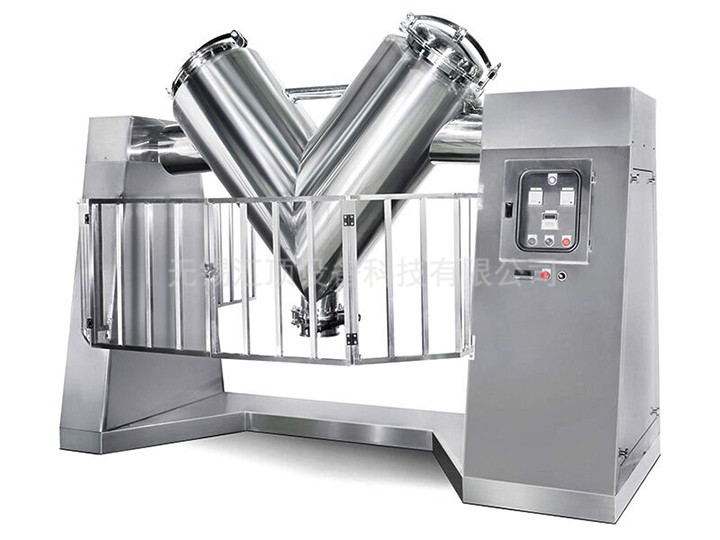 混料筒一般用不銹鋼制作,內外壁拋光,結構設計上保證無積料死角,清洗方便徹底。筒體上部有兩個進料口,下部有一個出料口。桶體可用手任意轉動,以便于出料。